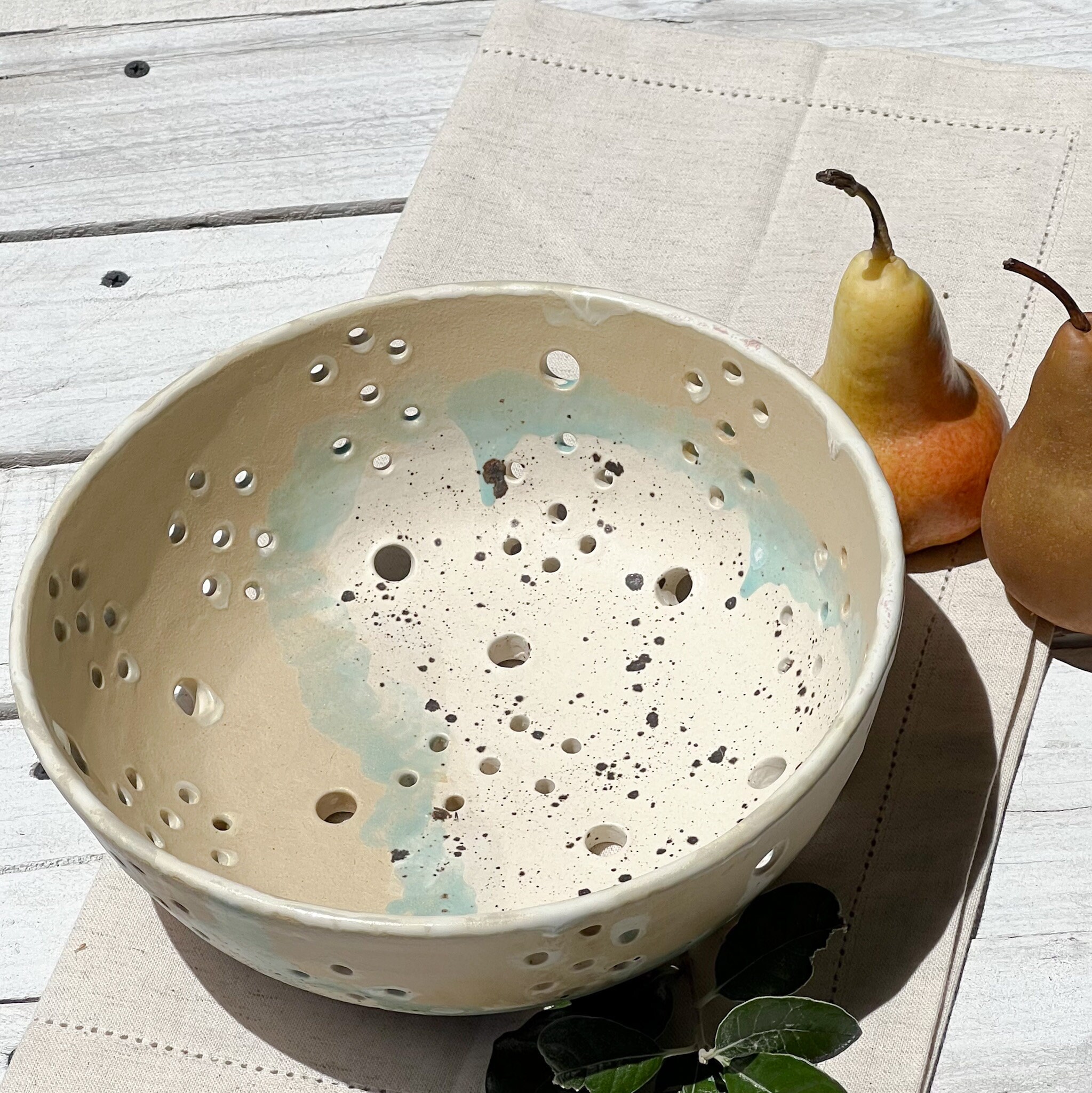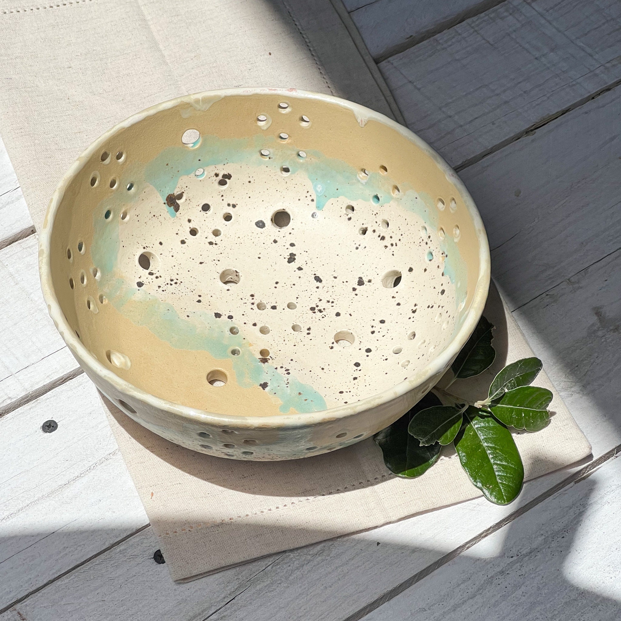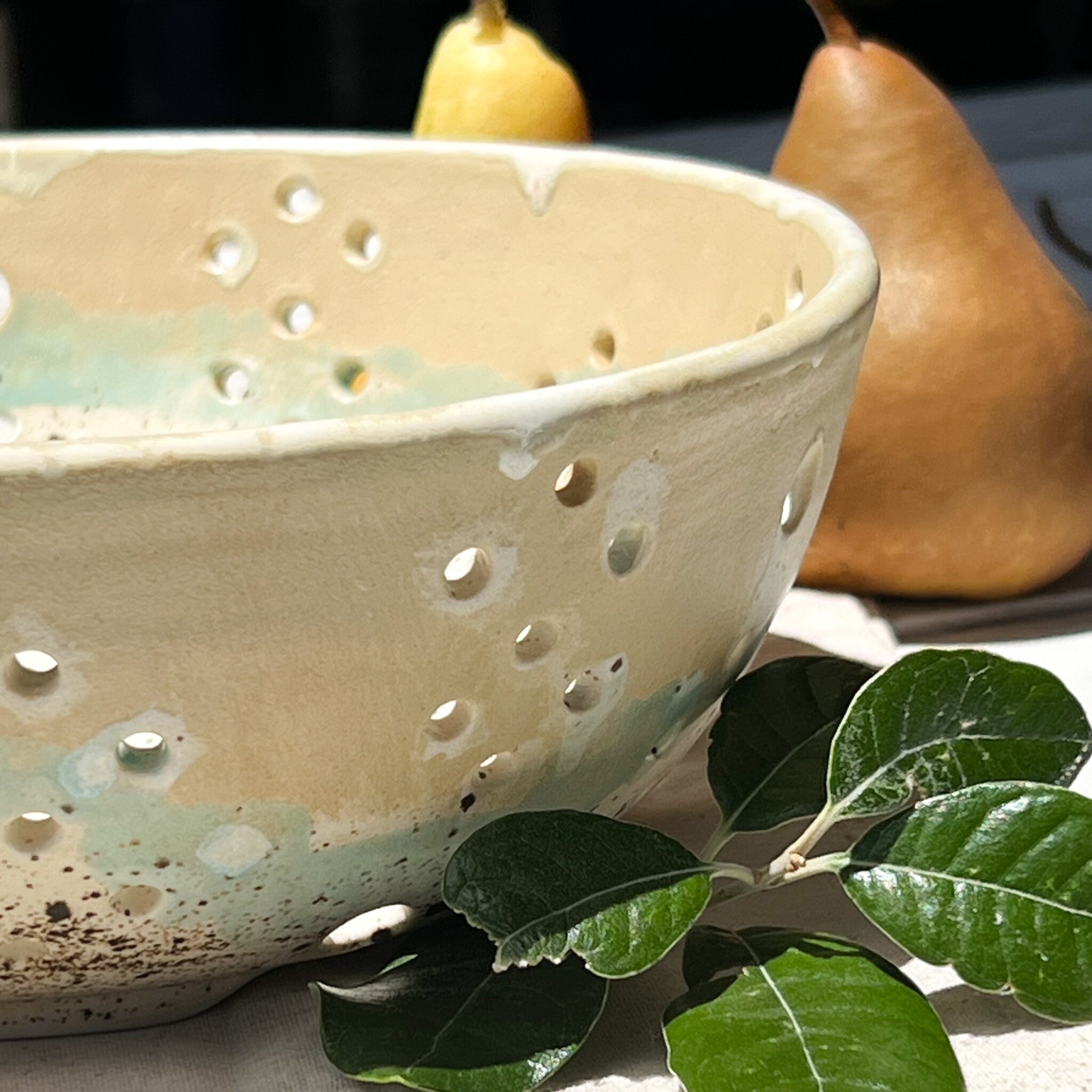 Cyria Colander; One of my most beautiful glazes. An asymmetrical placement of small and larger holes make this one a unique handmade beauty in my book! Use it as a berry bowl, or I think it's unique enough to just be on display anywhere, brimming with your favorite fruit, flowers or veggies. Enjoy!