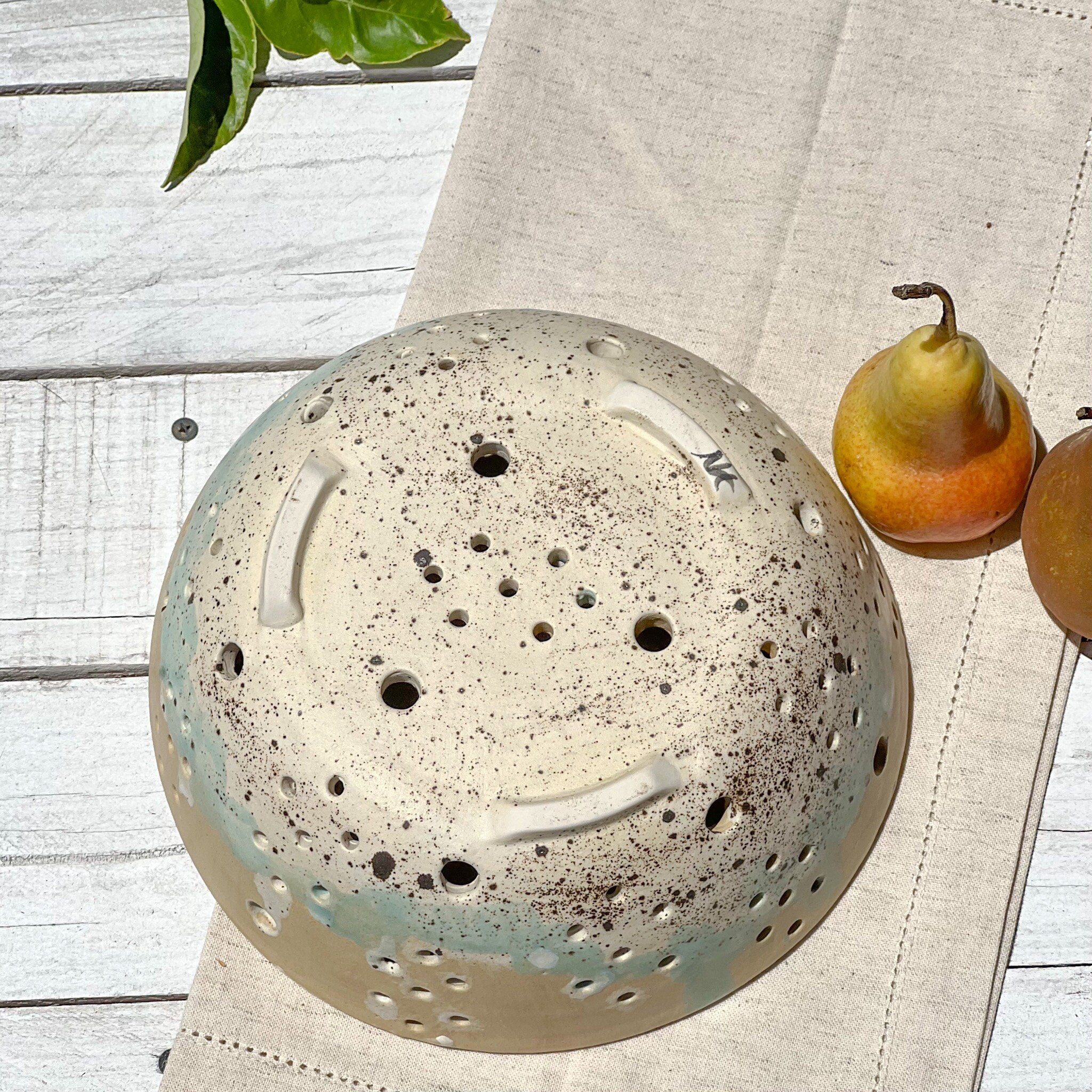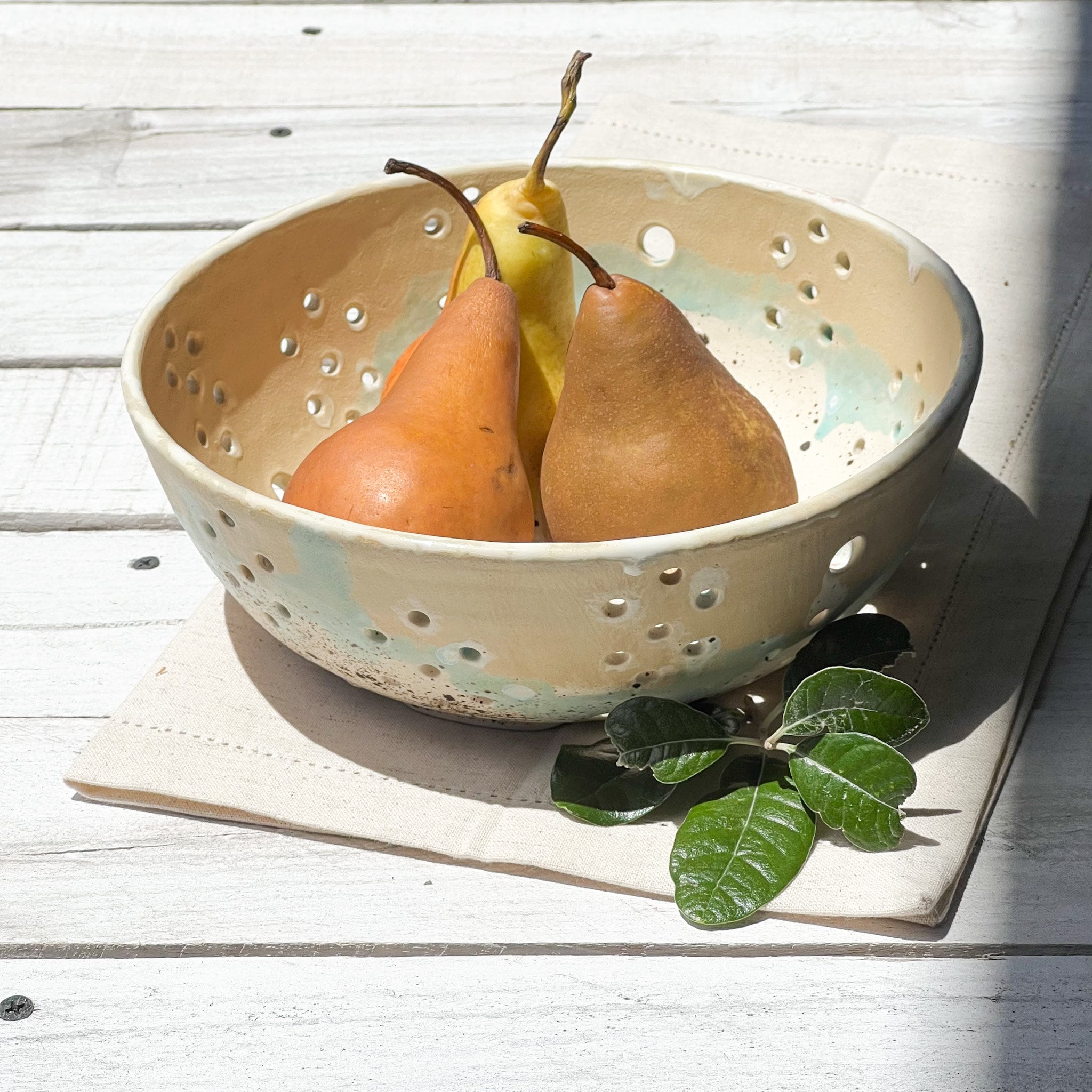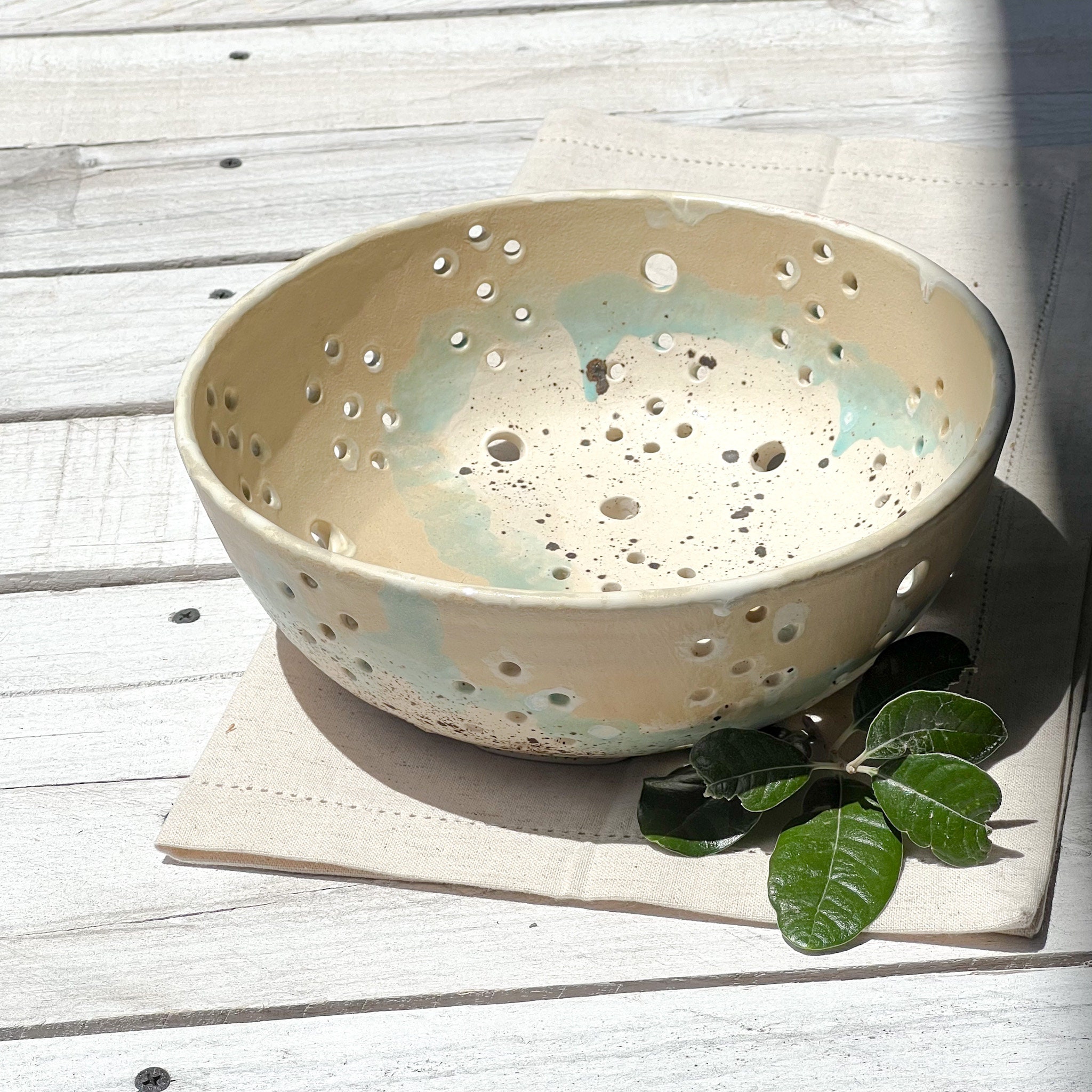 Cyria Colander; One of my most beautiful glazes. An asymmetrical placement of small and larger holes make this one a unique handmade beauty in my book! Use it as a berry bowl, or I think it's unique enough to just be on display anywhere, brimming with your favorite fruit, flowers or veggies. Enjoy!