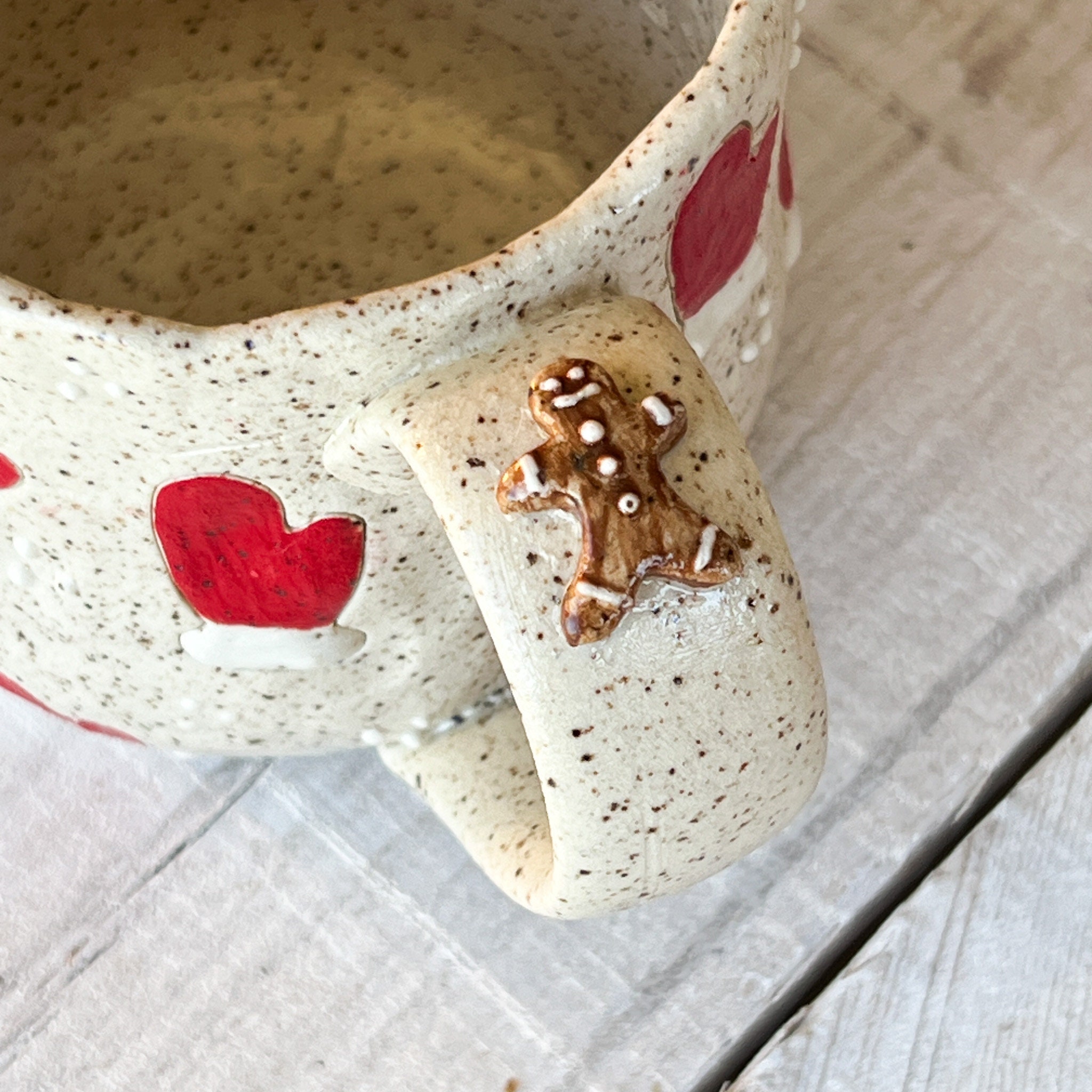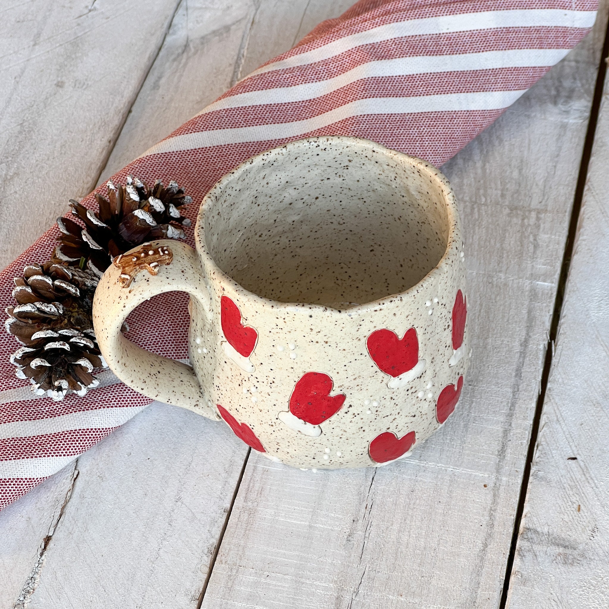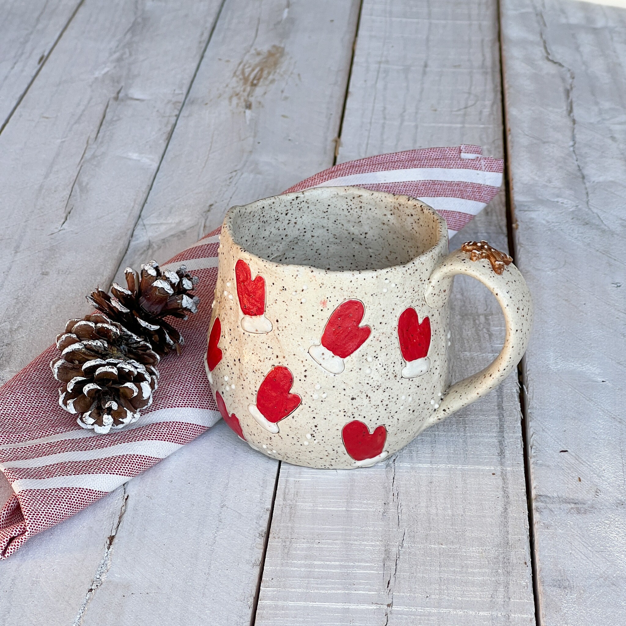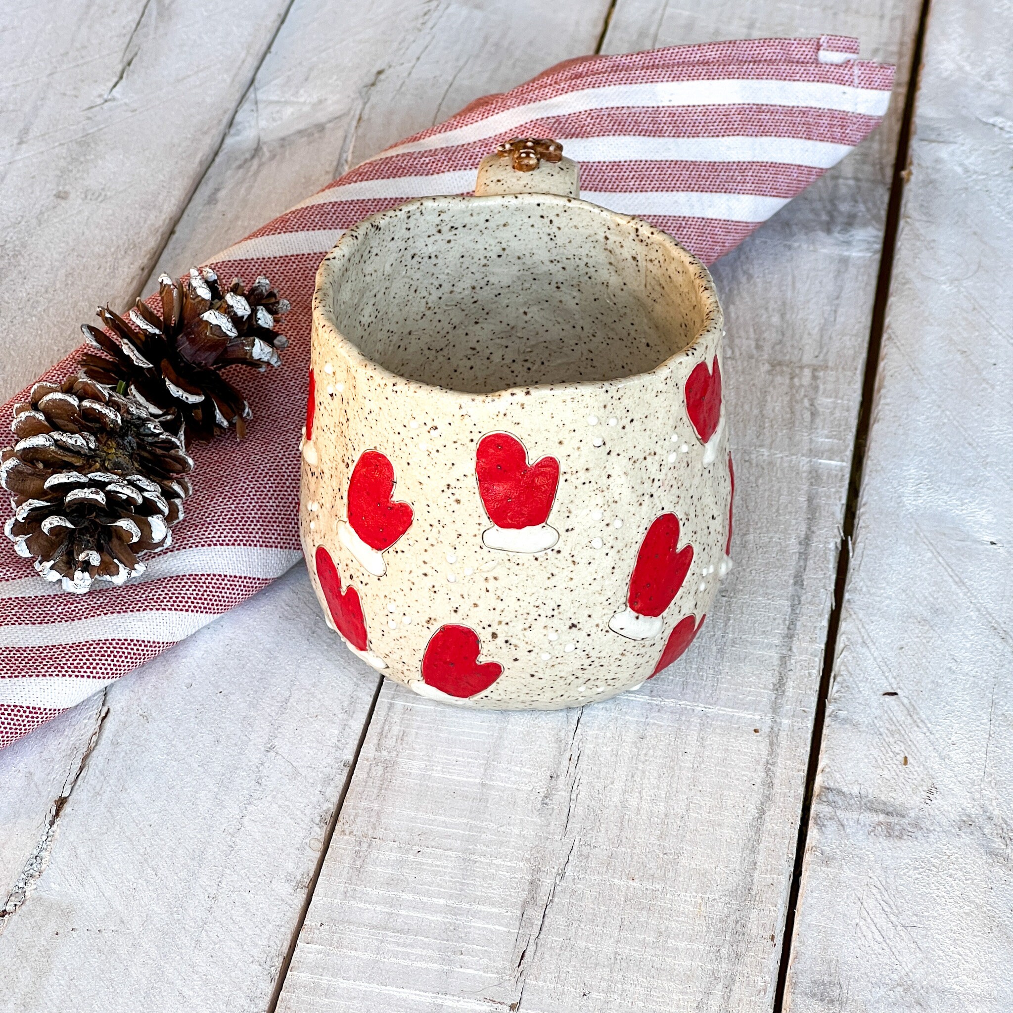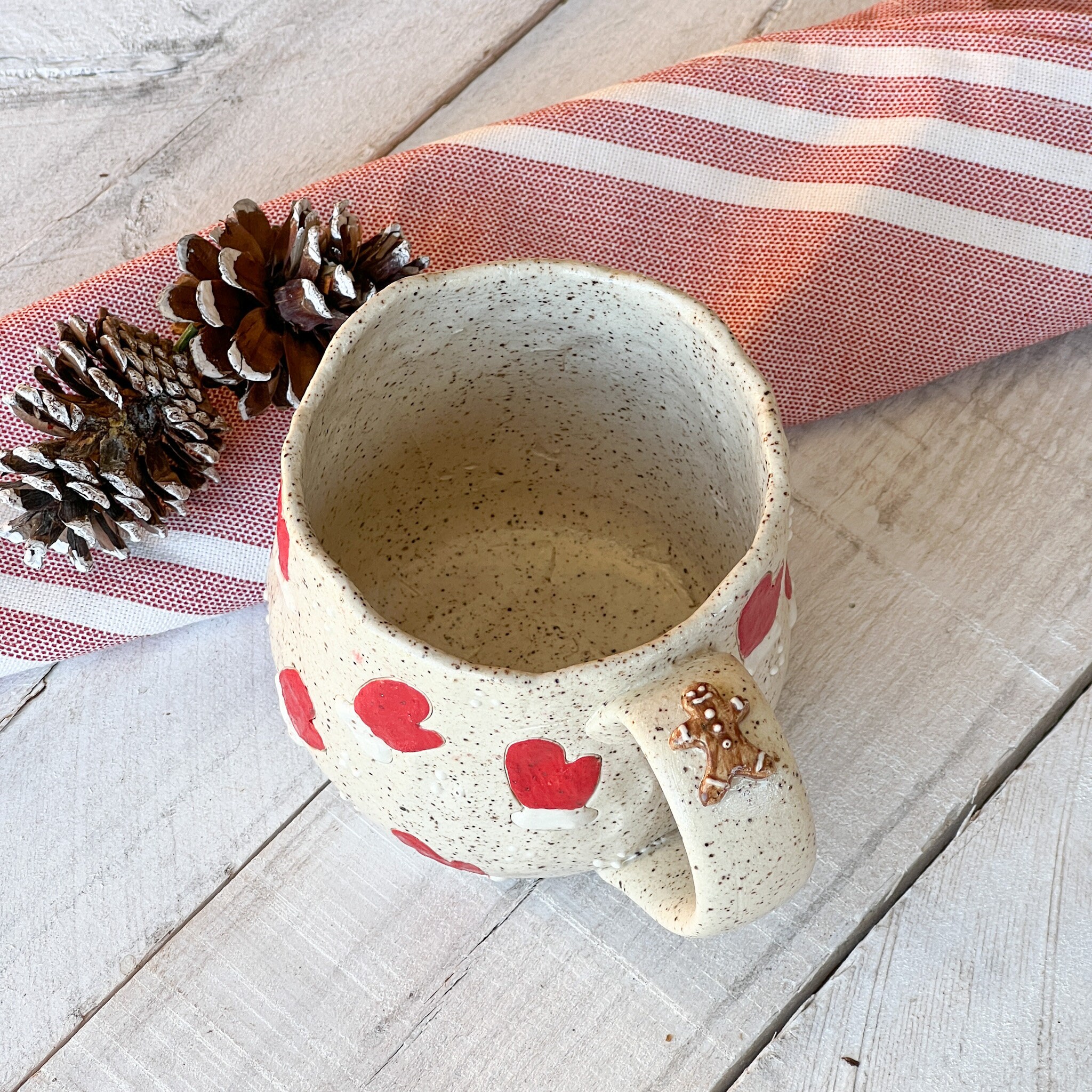 This Collection has a unique character and charm. Hand built ensuring no two mugs are alike. Whether you'er enjoying your morning coffee or winding down with a cozy cup of tea, this mug is promise to elevate your drink experience with its soulful beauty and tactile pleasure. Treat yourself to a daily dose of luxury or surprise someone special with a thoughtful, one of a kind gift from our Christmas Collection.