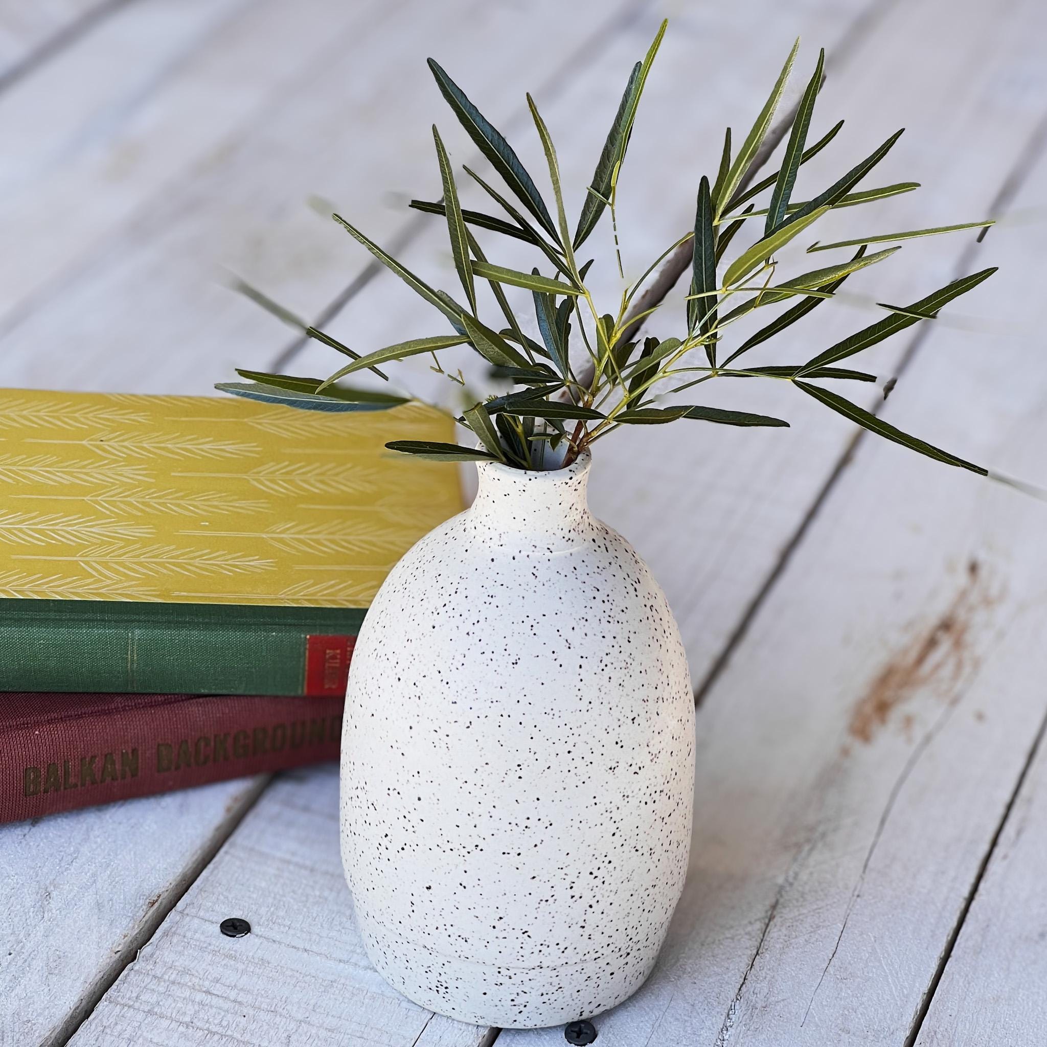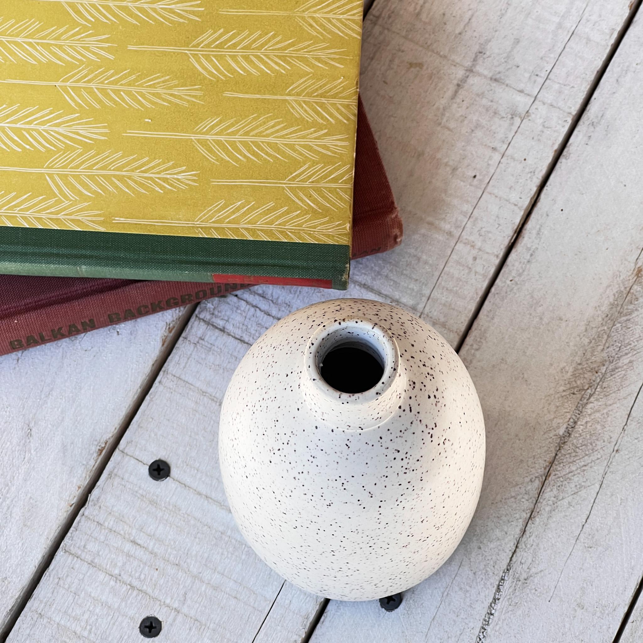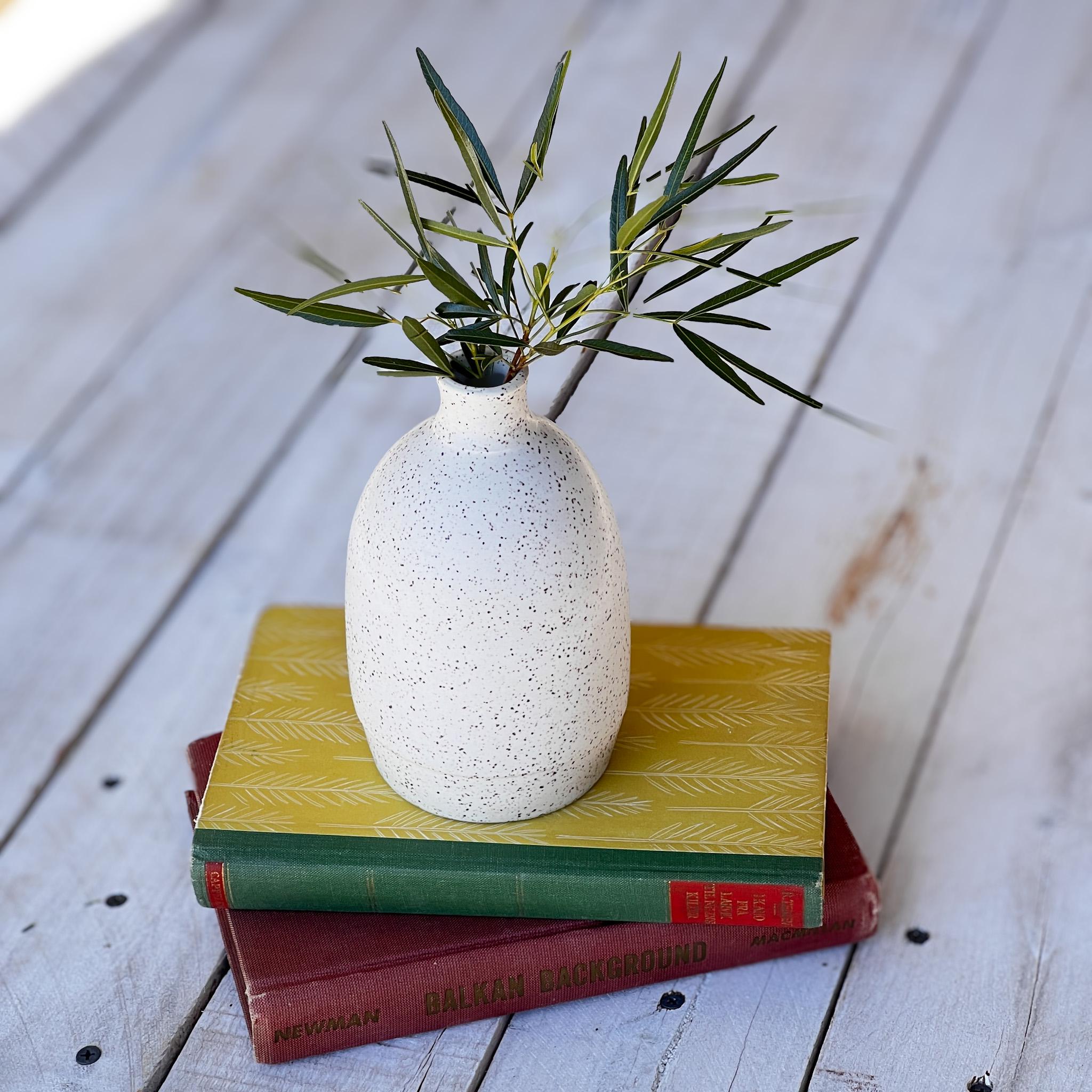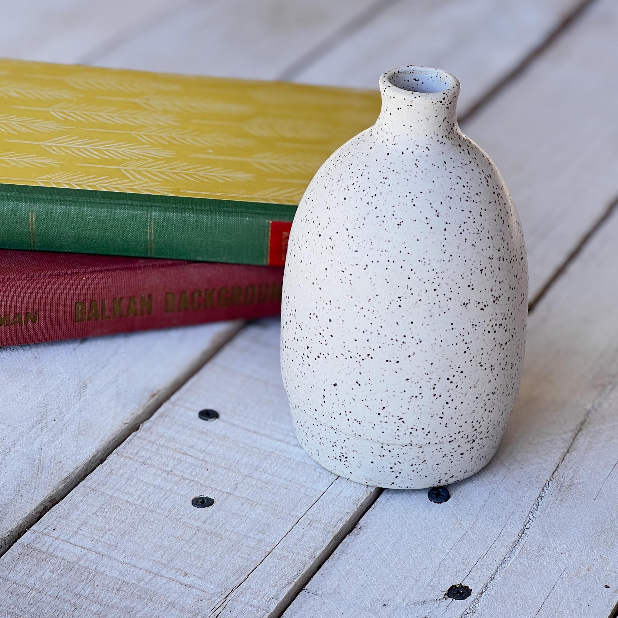 Bring a touch of simple beauty into your home with this one-of-a-kind handmade bud vase. Crafted with care in my studio, this vase features a soft white glaze with natural speckling that gives it warmth and character. Its clean, timeless design makes it the perfect piece for holding a single stem, a few dried flowers, or even standing alone as a piece of art.