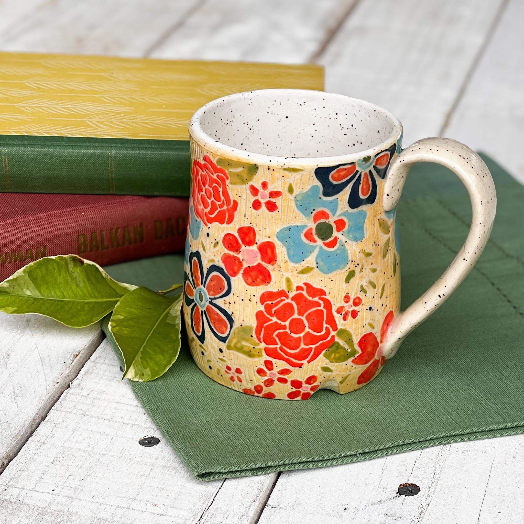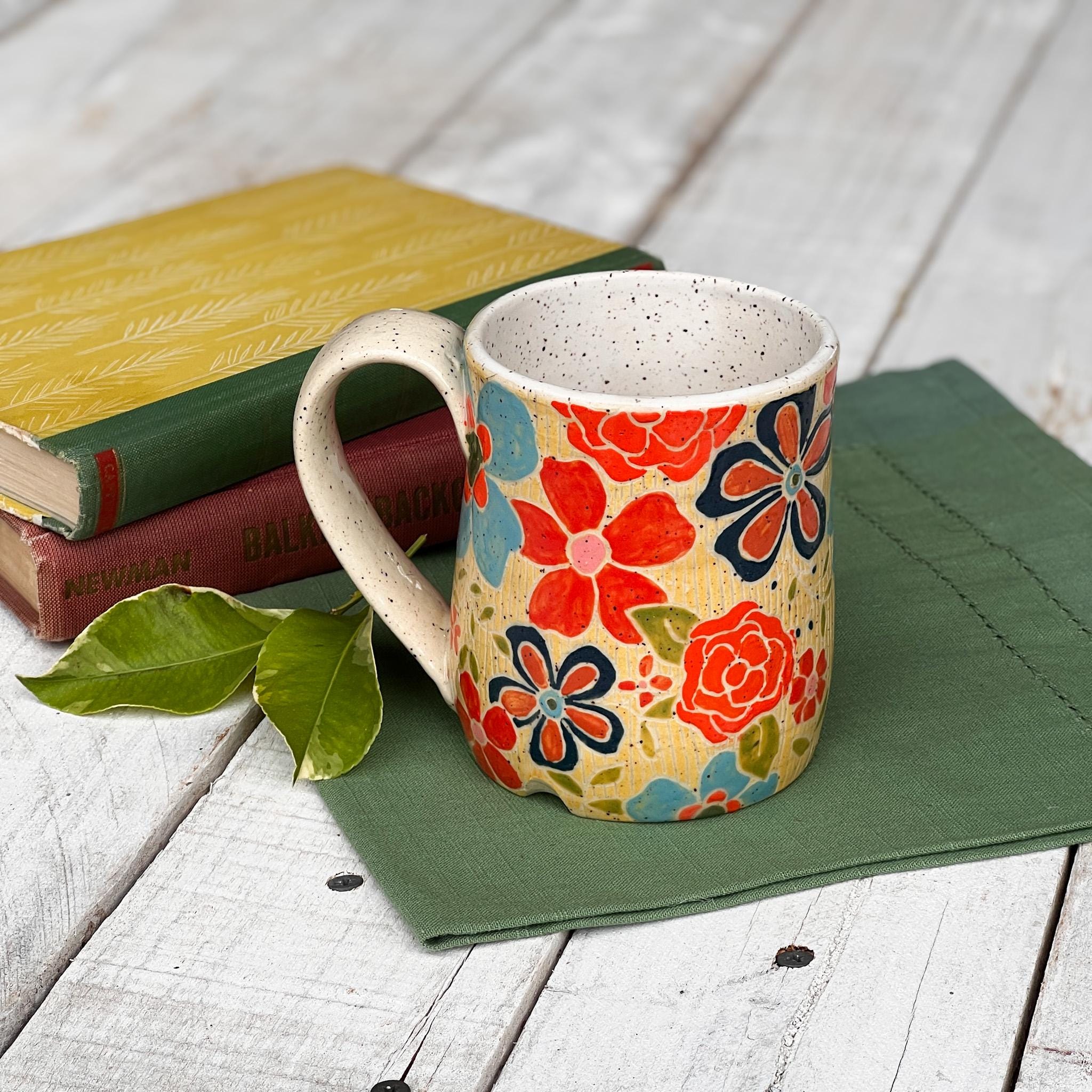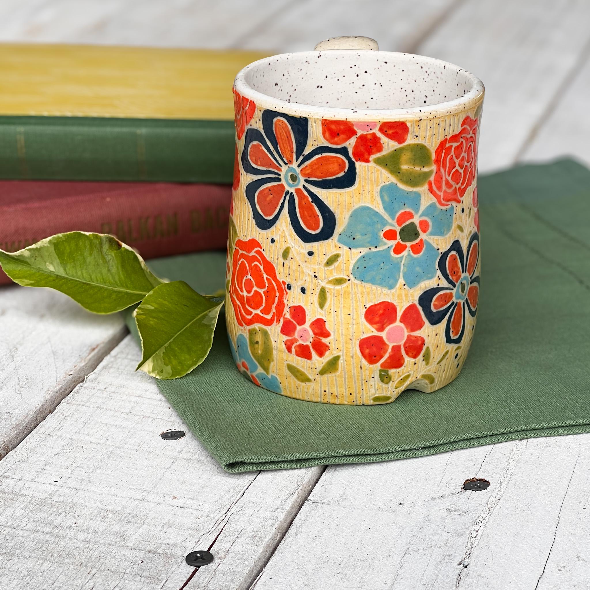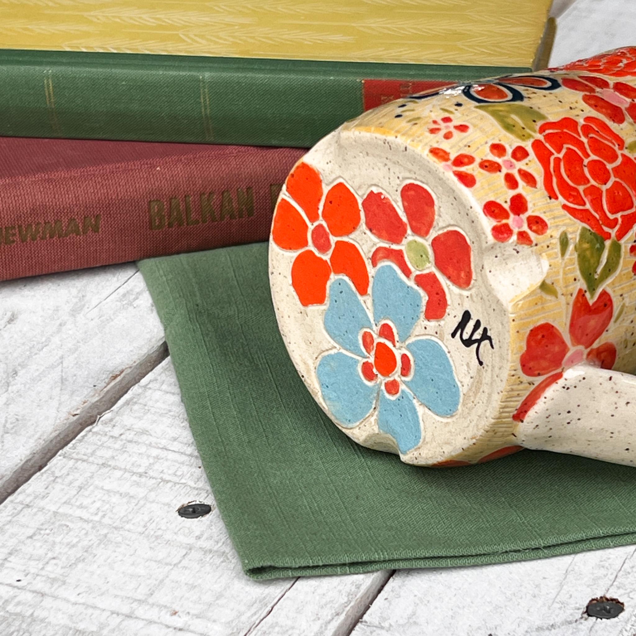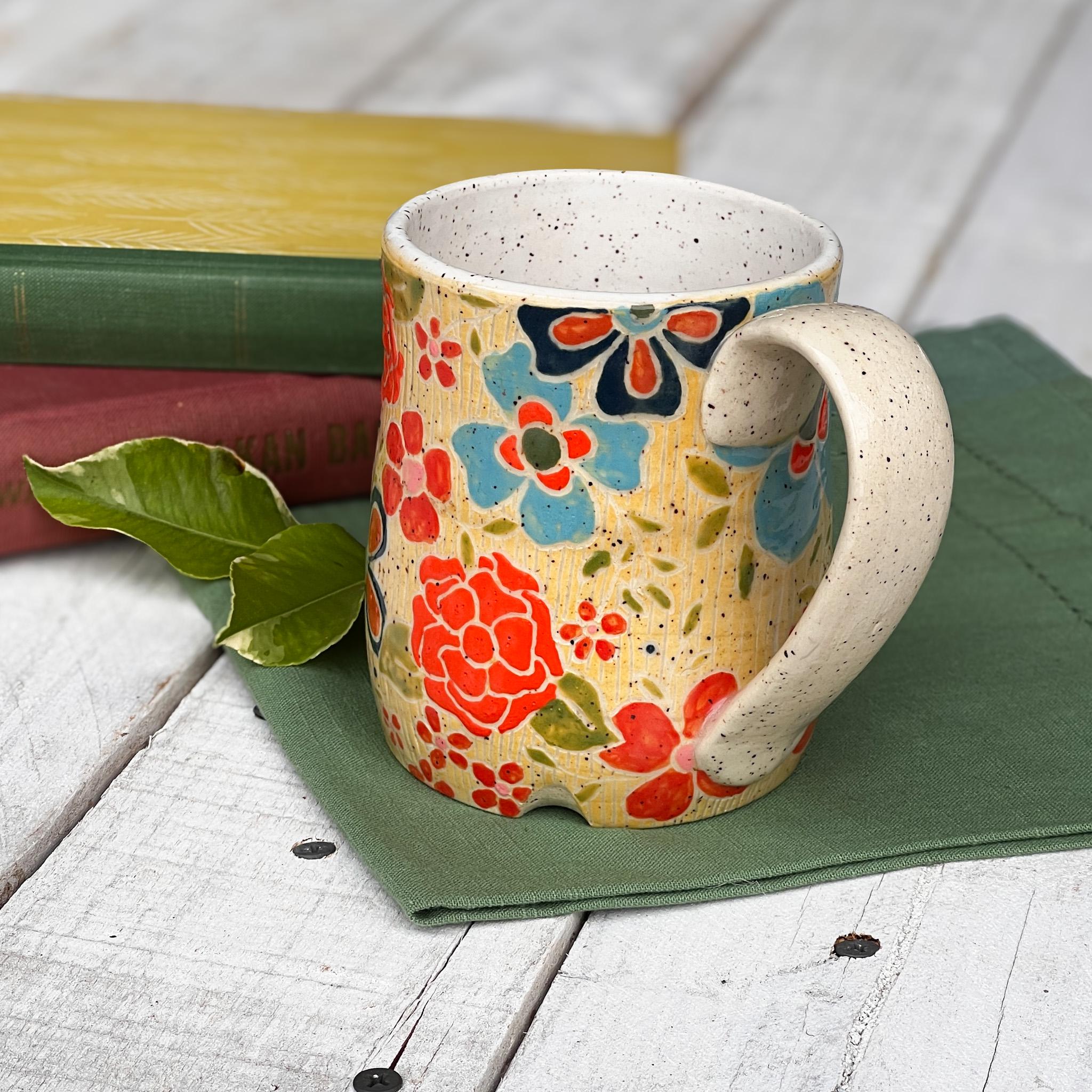 This Collection has a unique character and charm. Hand Wheel Thrown ensuring no two mugs are alike. Whether you'er enjoying your morning coffee or winding down with a cozy cup of tea, this mug is promise to elevate your drink experience with its soulful beauty and tactile pleasure. Treat yourself to a daily dose of luxury or surprise someone special with a thoughtful, one of a kind gift from our Blossom Wildwood collection.