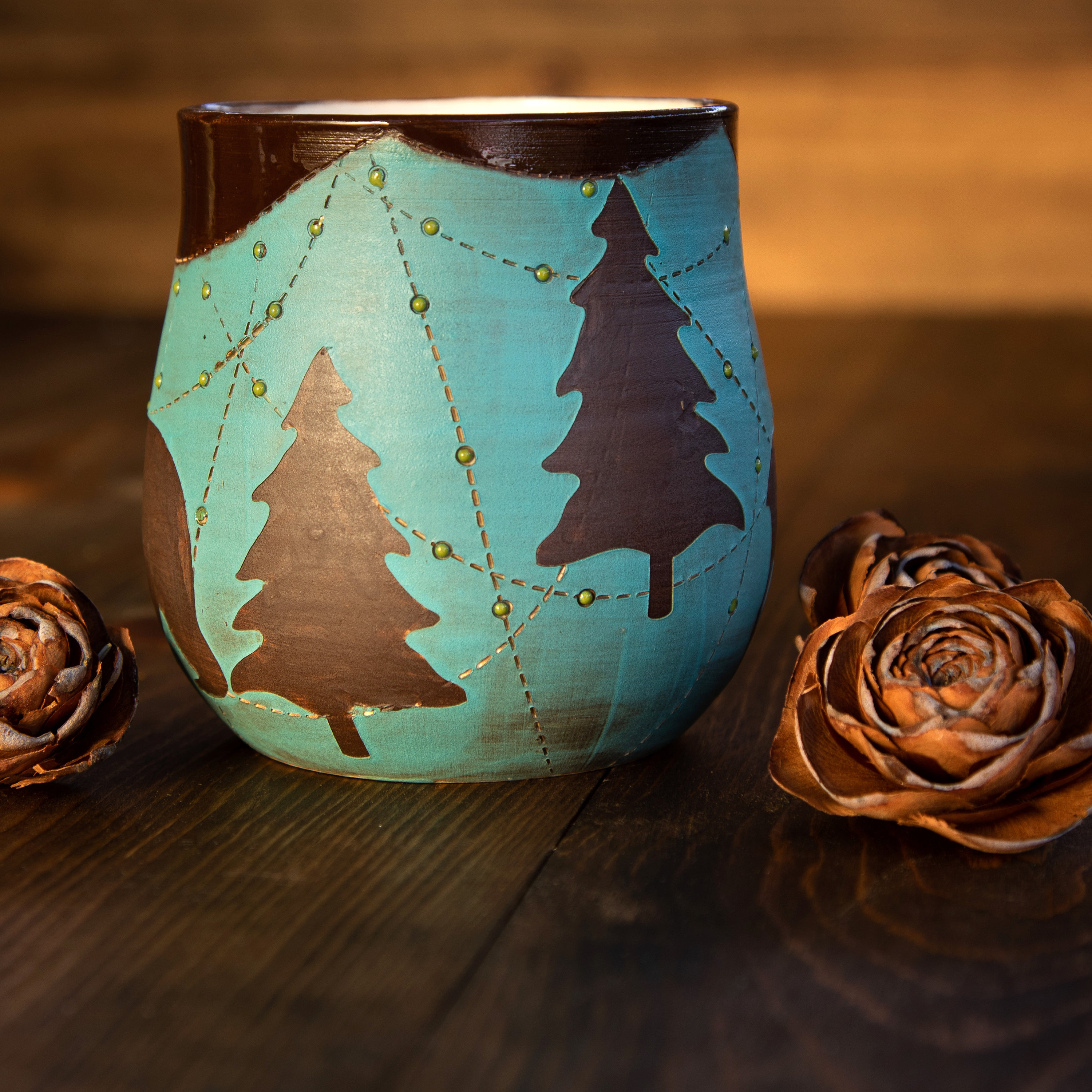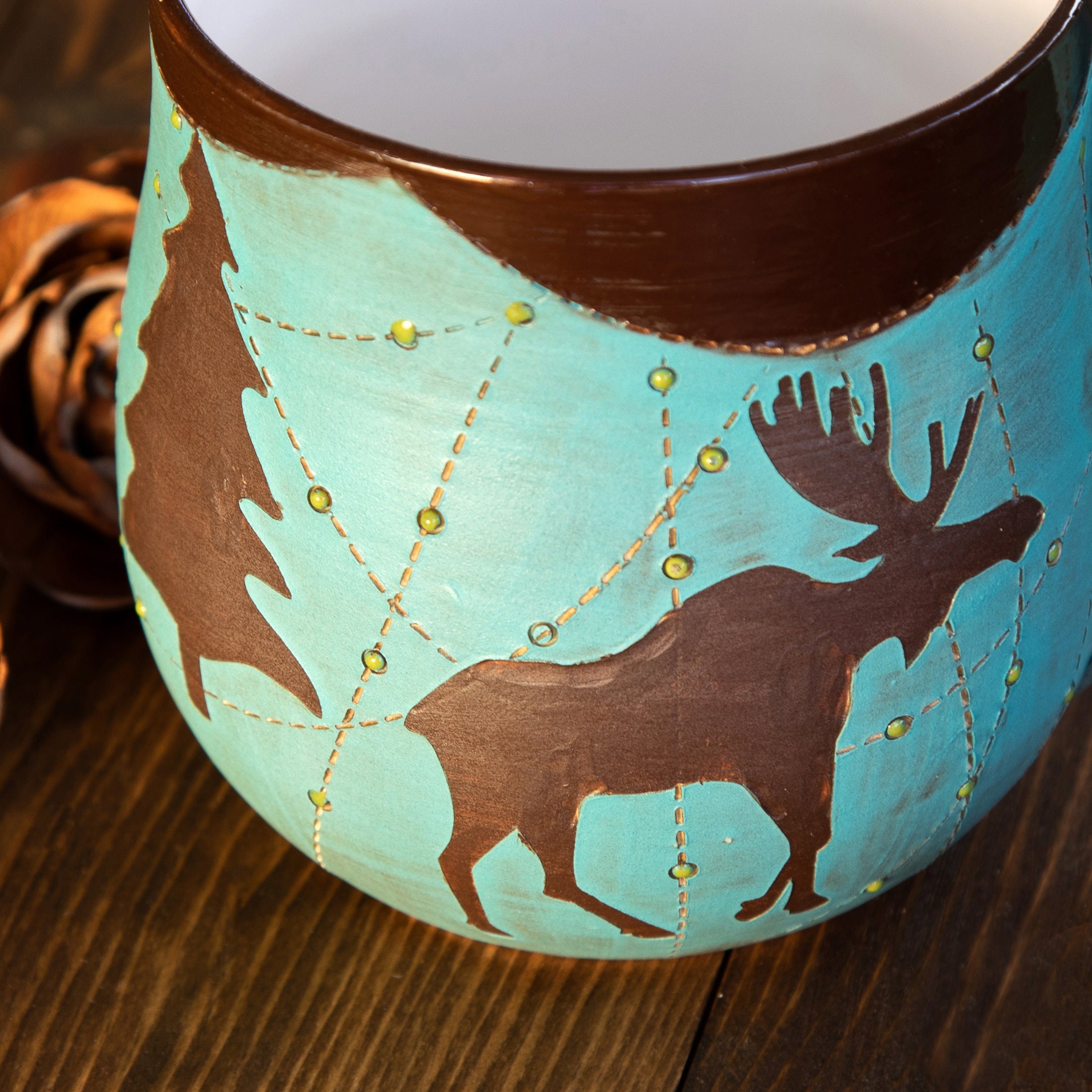 I love this mug! Its a favorite to use at the cabin or woodsy back yard, get your outside on! Moose, Bear and tall pines decorate in a matte finish with smooth rim. Bound to get lots of admiring complements!
