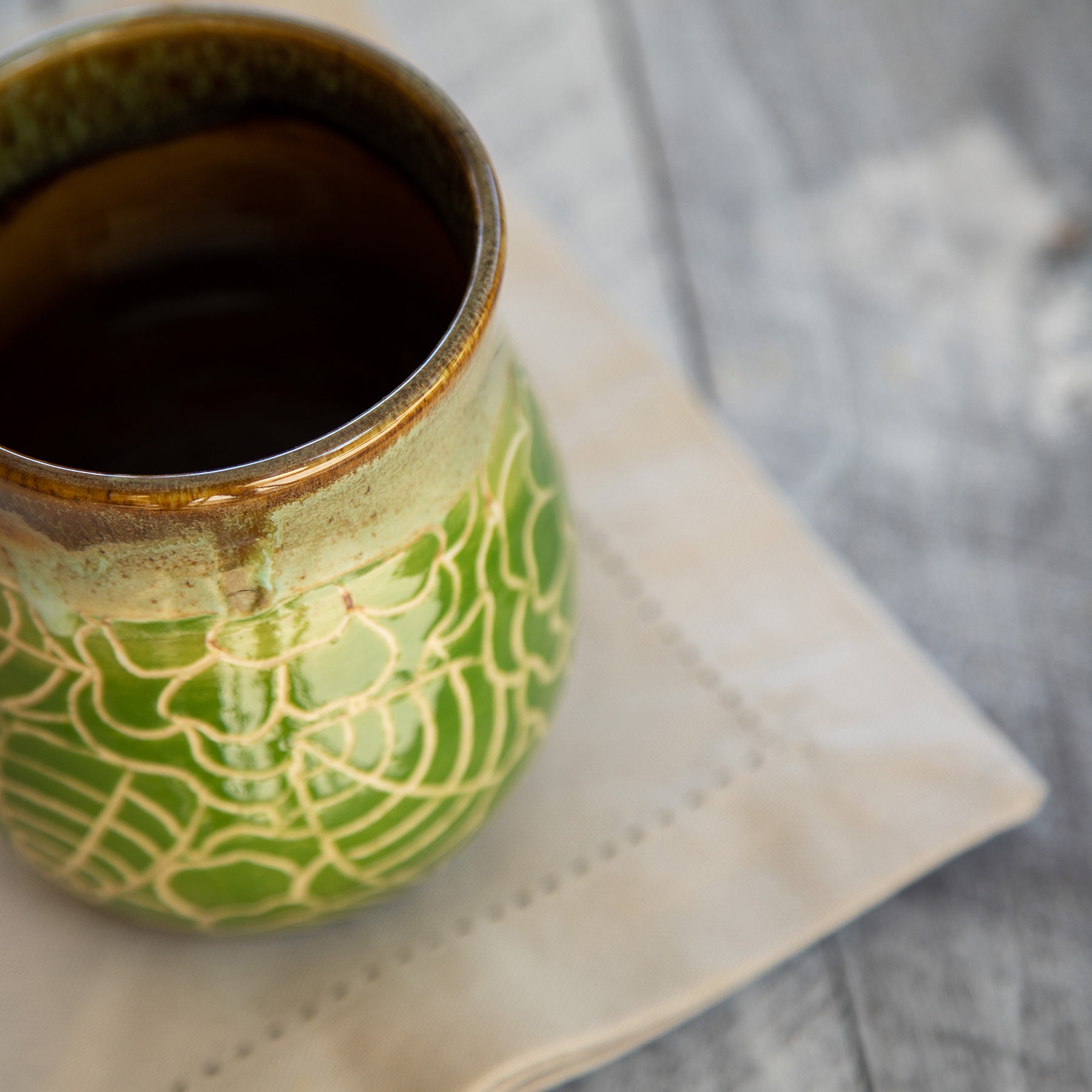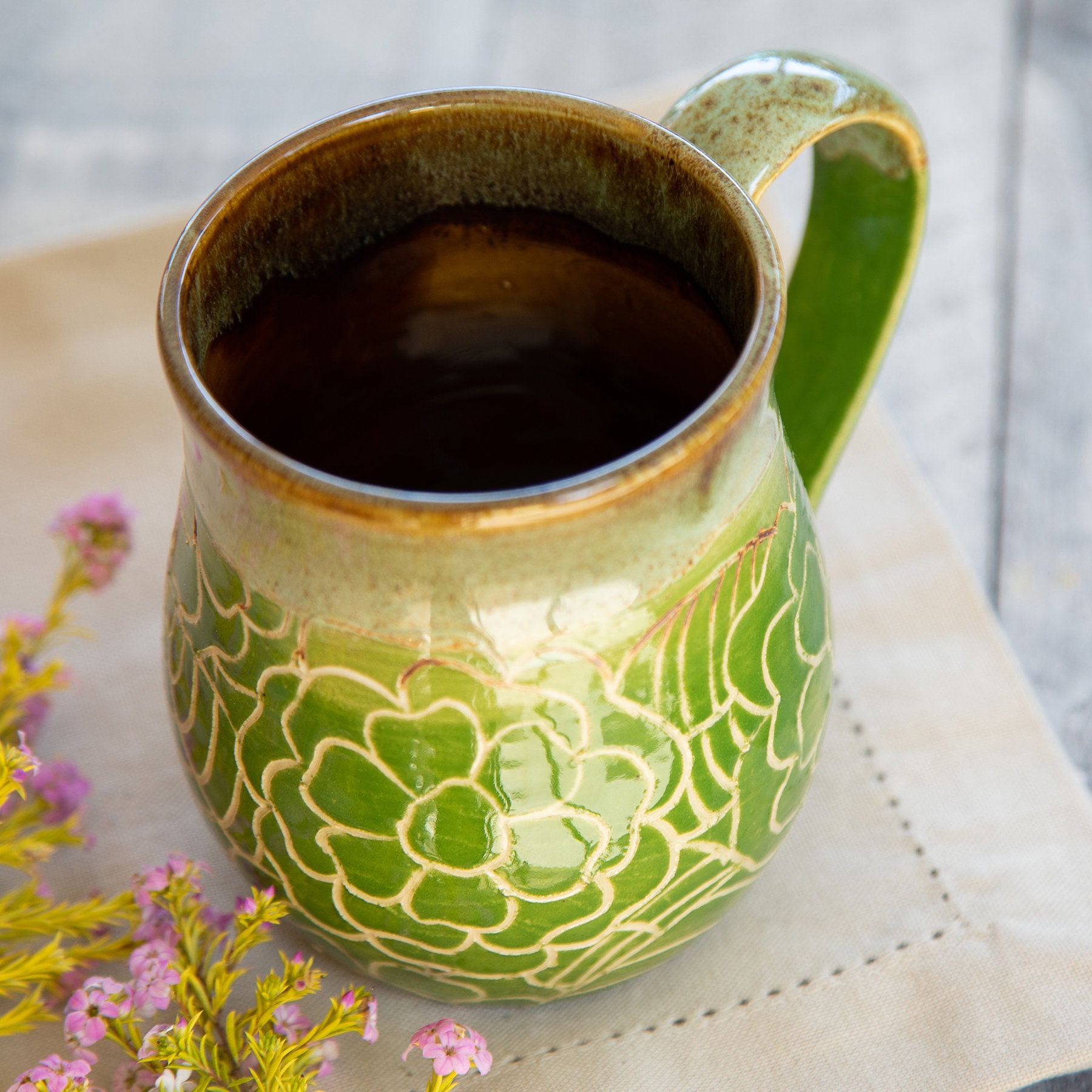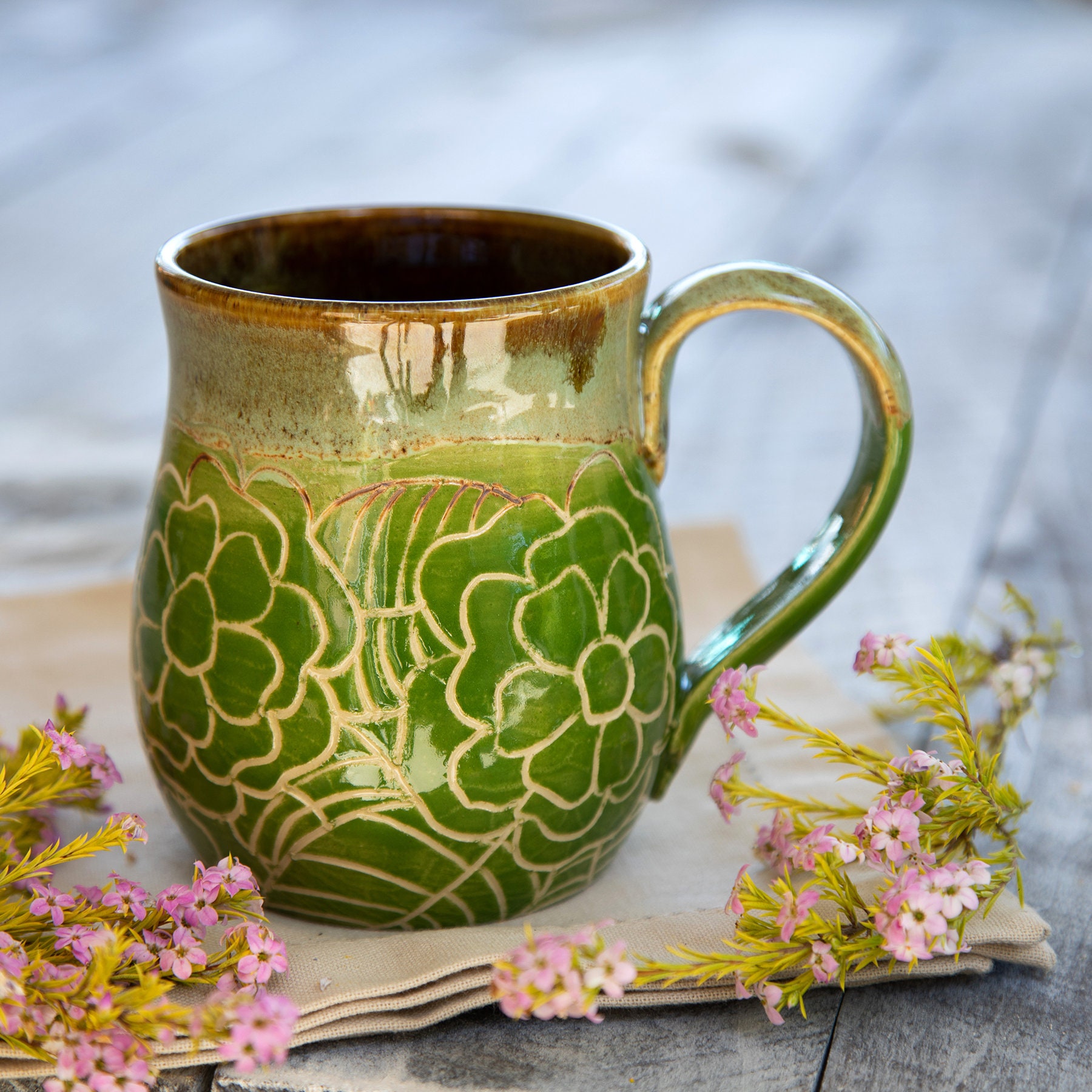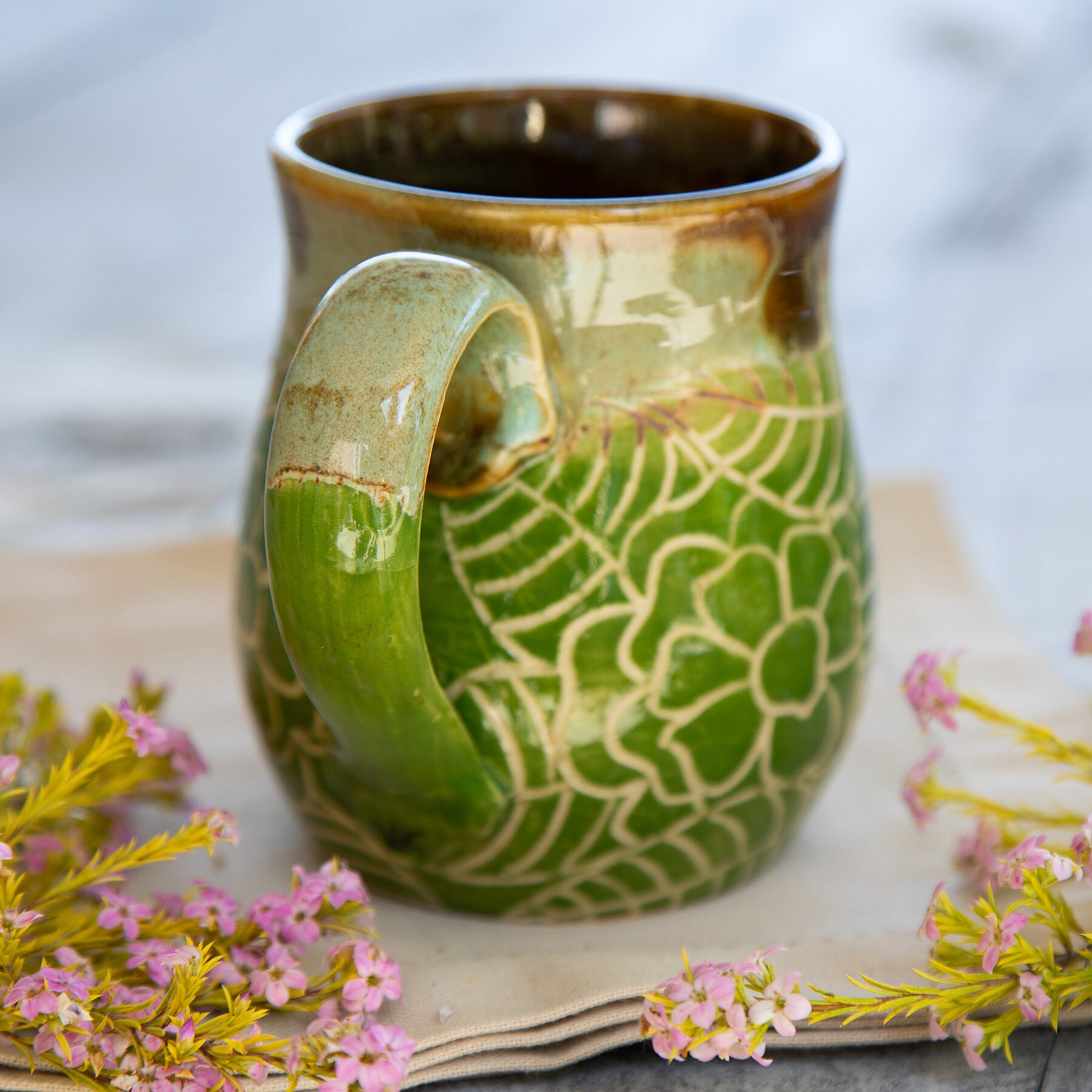 Earthy browns inside to match you morning coffee, new day green blossoms on the outside for your hands to hold. These colors blend to start the new day as you walk about your garden